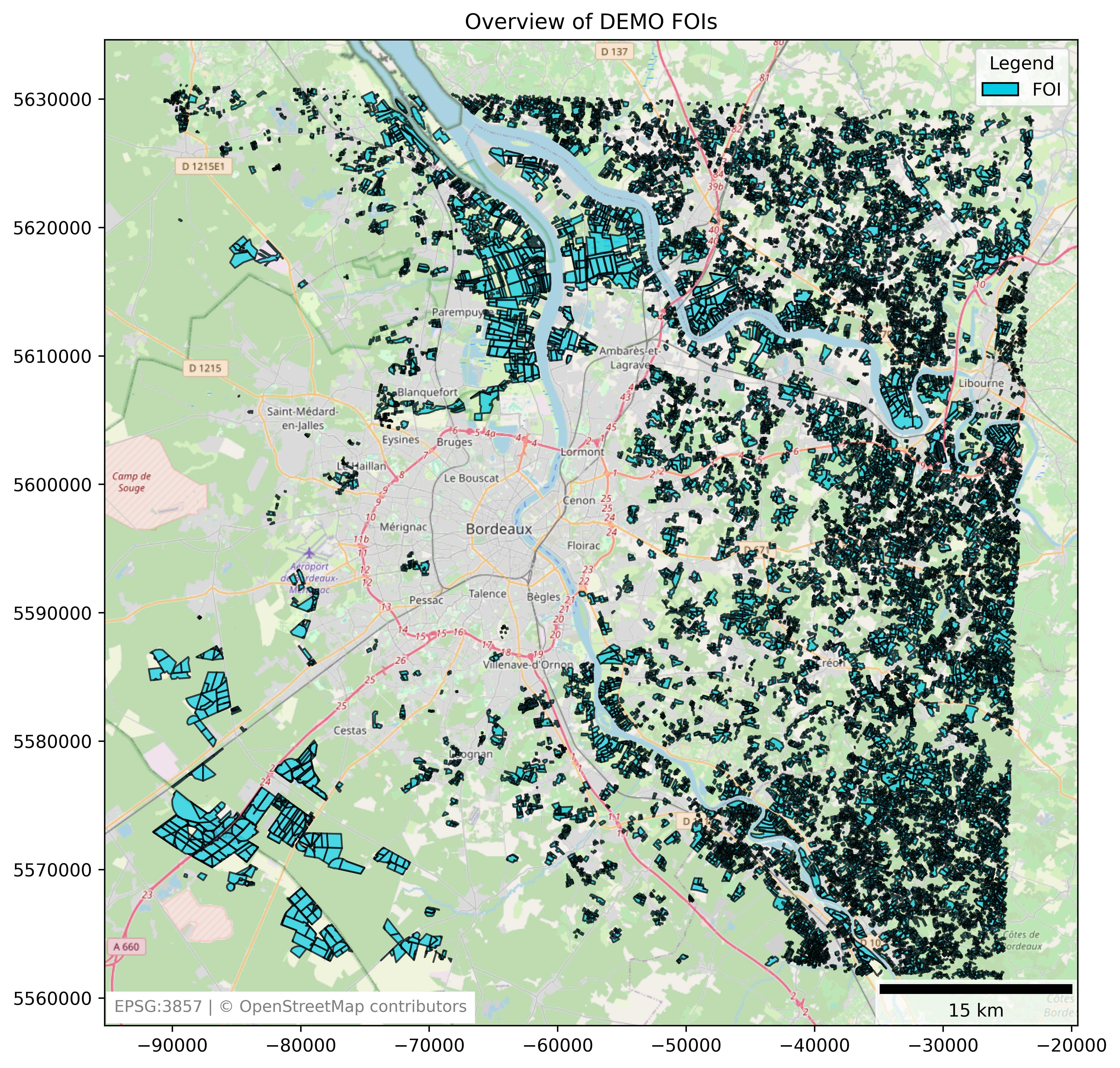 For learning and demonstration purposes, we have generated signals and markers for 20,280 agricultural parcels, which are displayed in the Area Monitoring app as part of the DEMO_FR23 scope. The selected area is near Bordeaux, and is also available as Planet Sandbox Data.