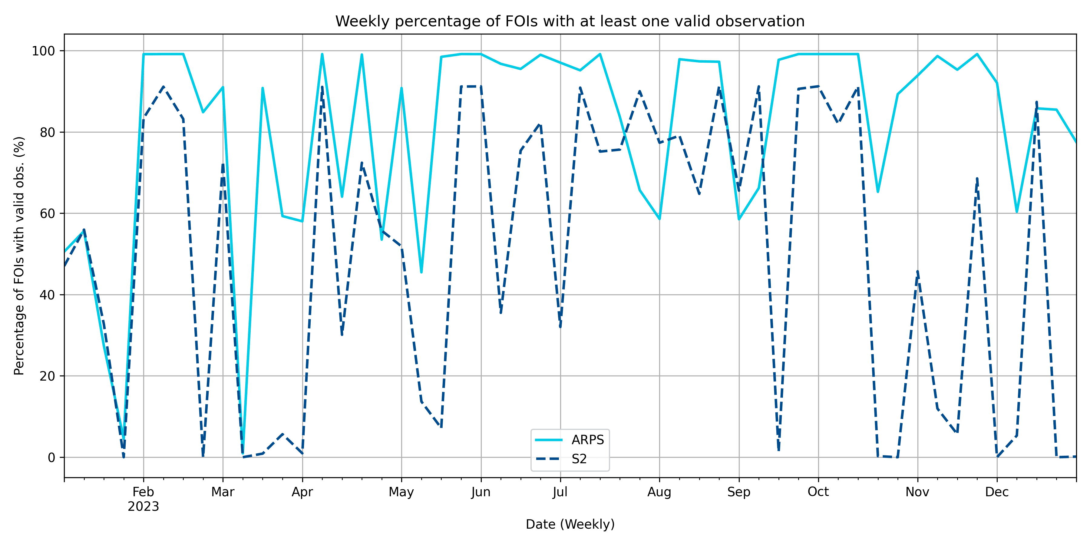 In general, this difference can result in missed events or observations. The overview below for 2023 shows the percentage of FOIs that had at least one valid observation. With ARPS, there were only two weeks—one in January and one in March—when no valid observations were available due to clouds, compared to nine such weeks with Sentinel-2.