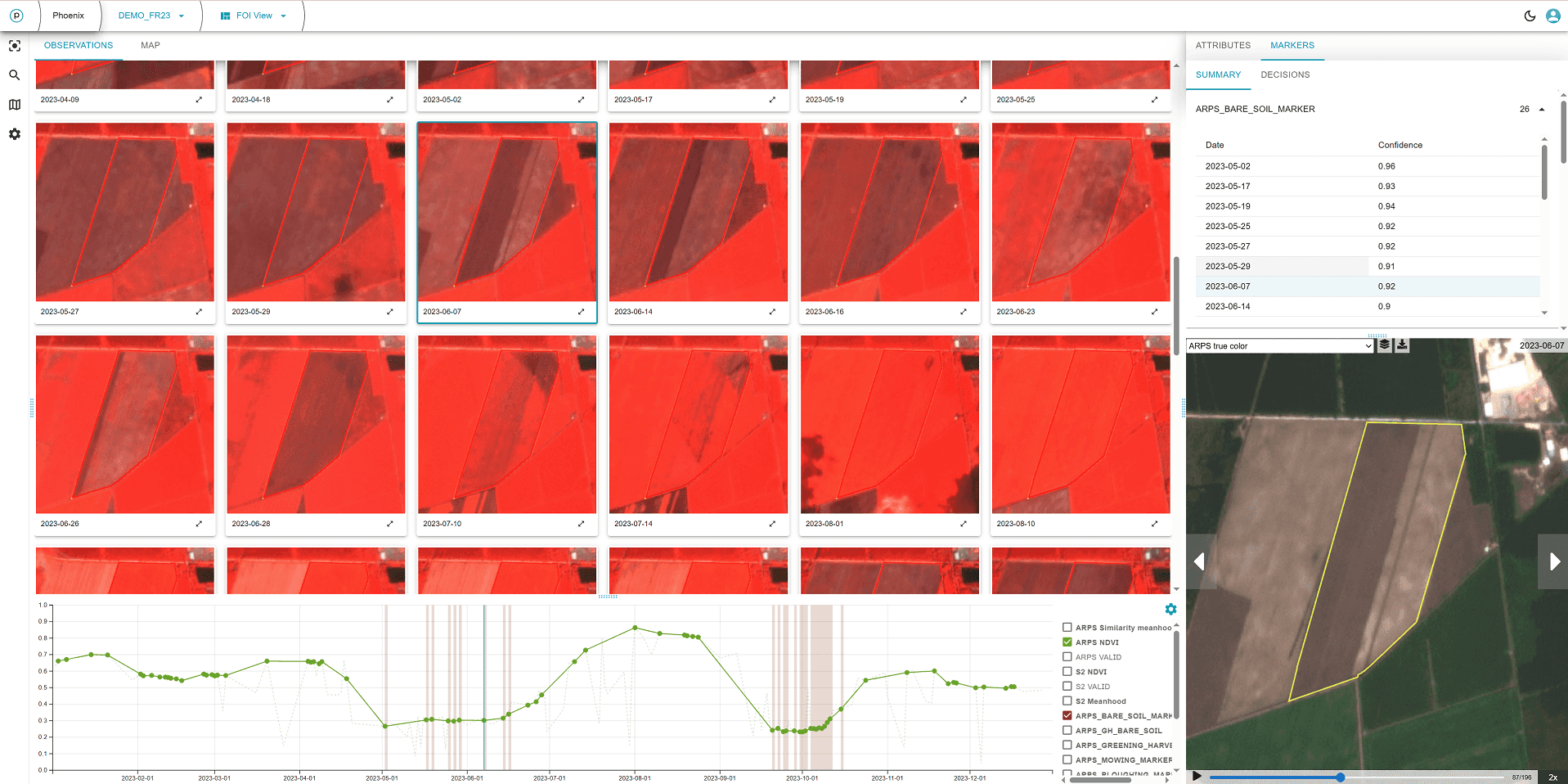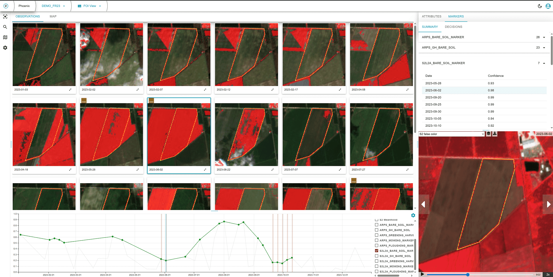 How it works: The bare-soil marker assigns a probability (0-1 scale) to each valid Sentinel-2 observation indicating the likelihood that the FOI area has exposed bare soil. All observations with bare-soil probability above a user-defined threshold (typically set to 0.8) are classified as bare-soil observations.