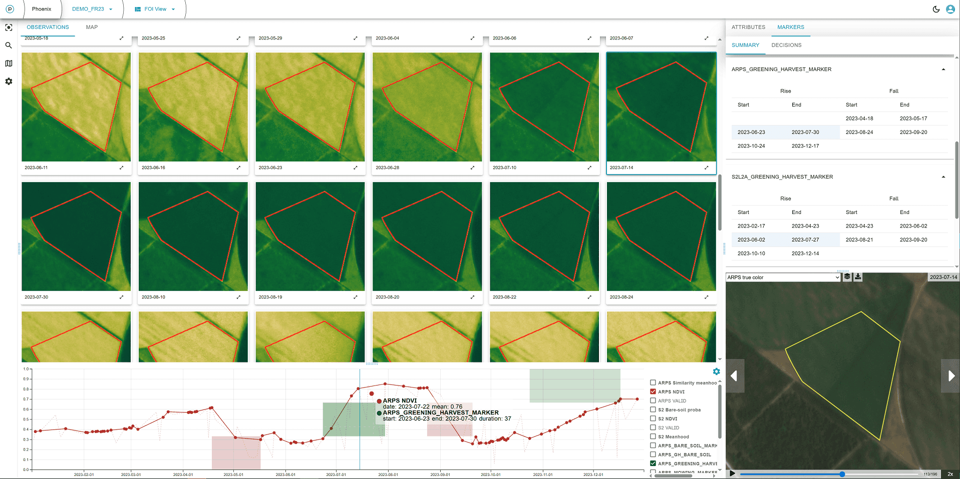 - Similarly, light red strip corresponds to an extended harvest phase and dark red strip to the "actual" harvest phase. The distinction between the extended and "actual" phase becomes important when we condition the eligibility with e.g. start of the greening phase or harvesting of the crop within a required or forbidden period. If we take a look at the harvest period and imagine a potential rule that the main crop should not be harvested before June 15th: the "actual" harvest period starts when we, for the first time, notice the consequence of the harvest, i.e. a significant drop of the NDVI value, and this happened after June 15th. If we were validating the eligibility based on the start of the extended harvest phase, FOI would be found harvested before the June 15th and therefore ineligible.