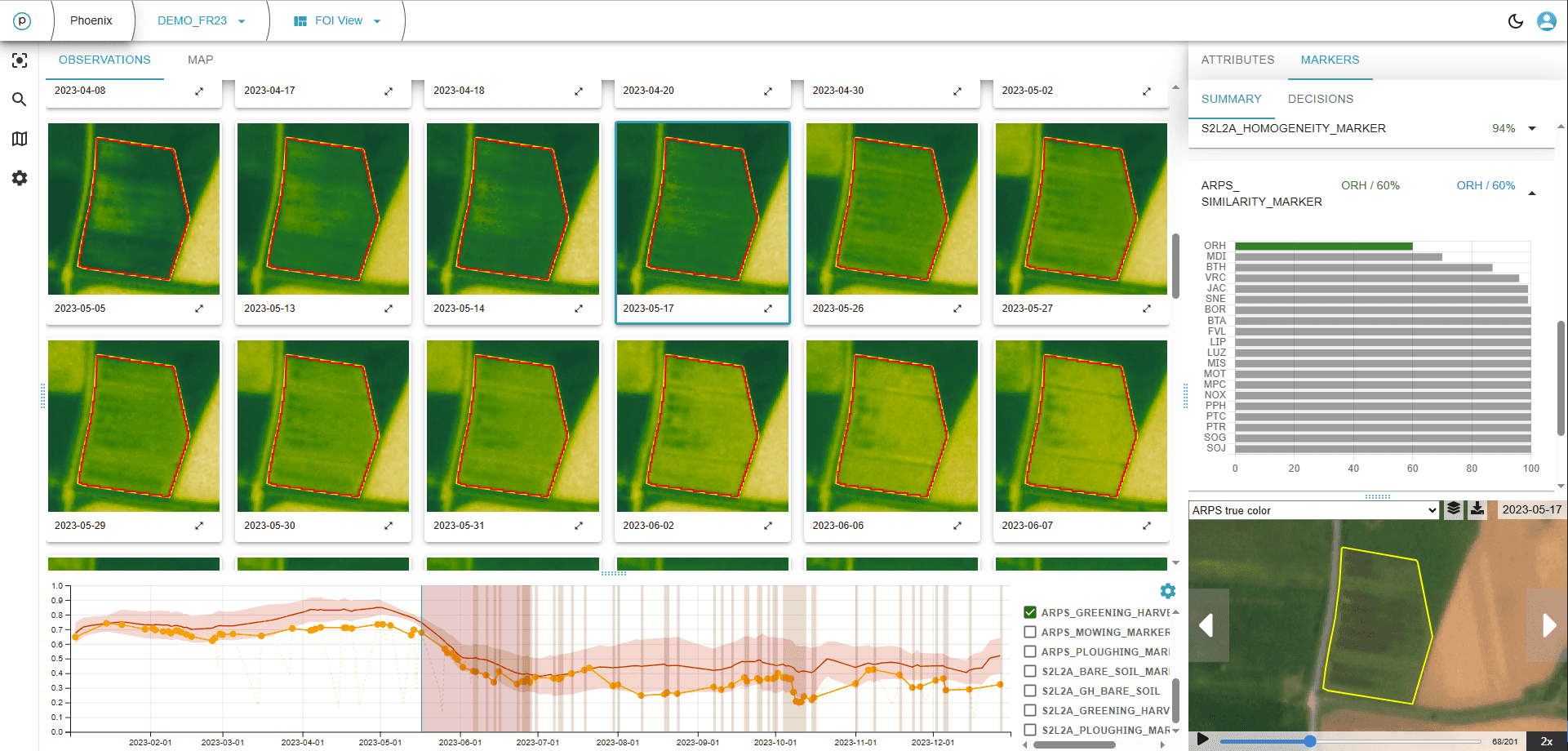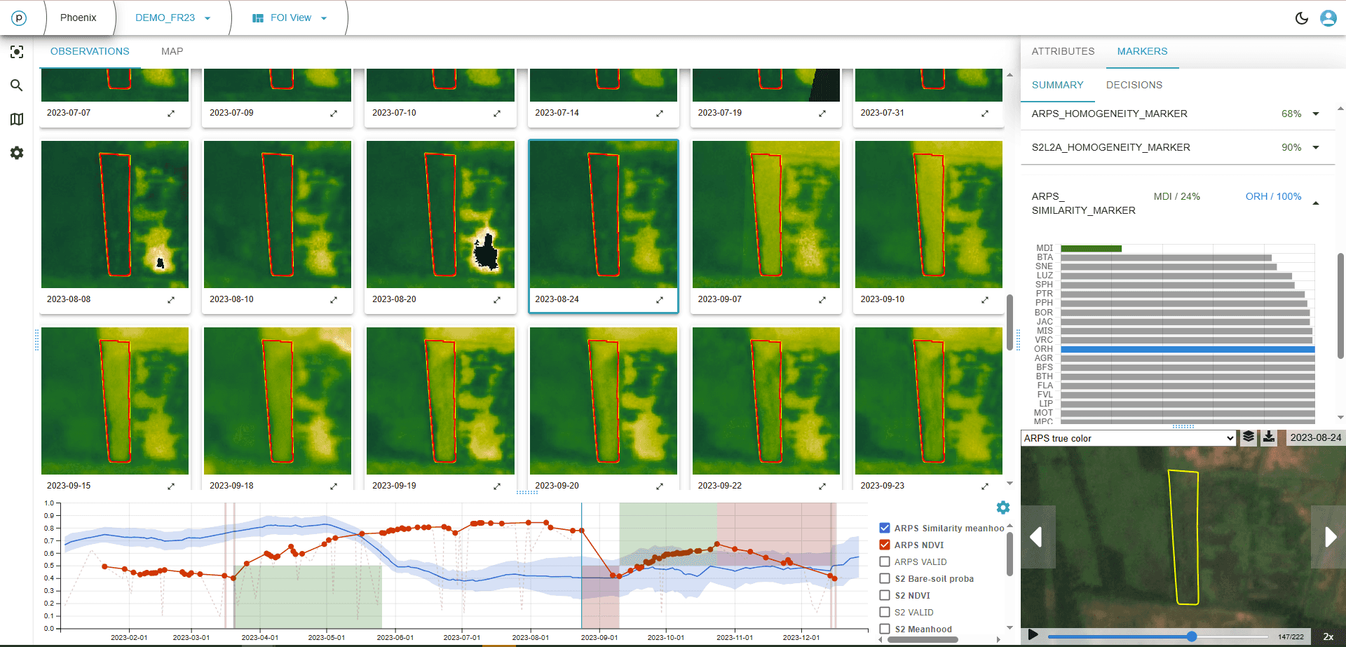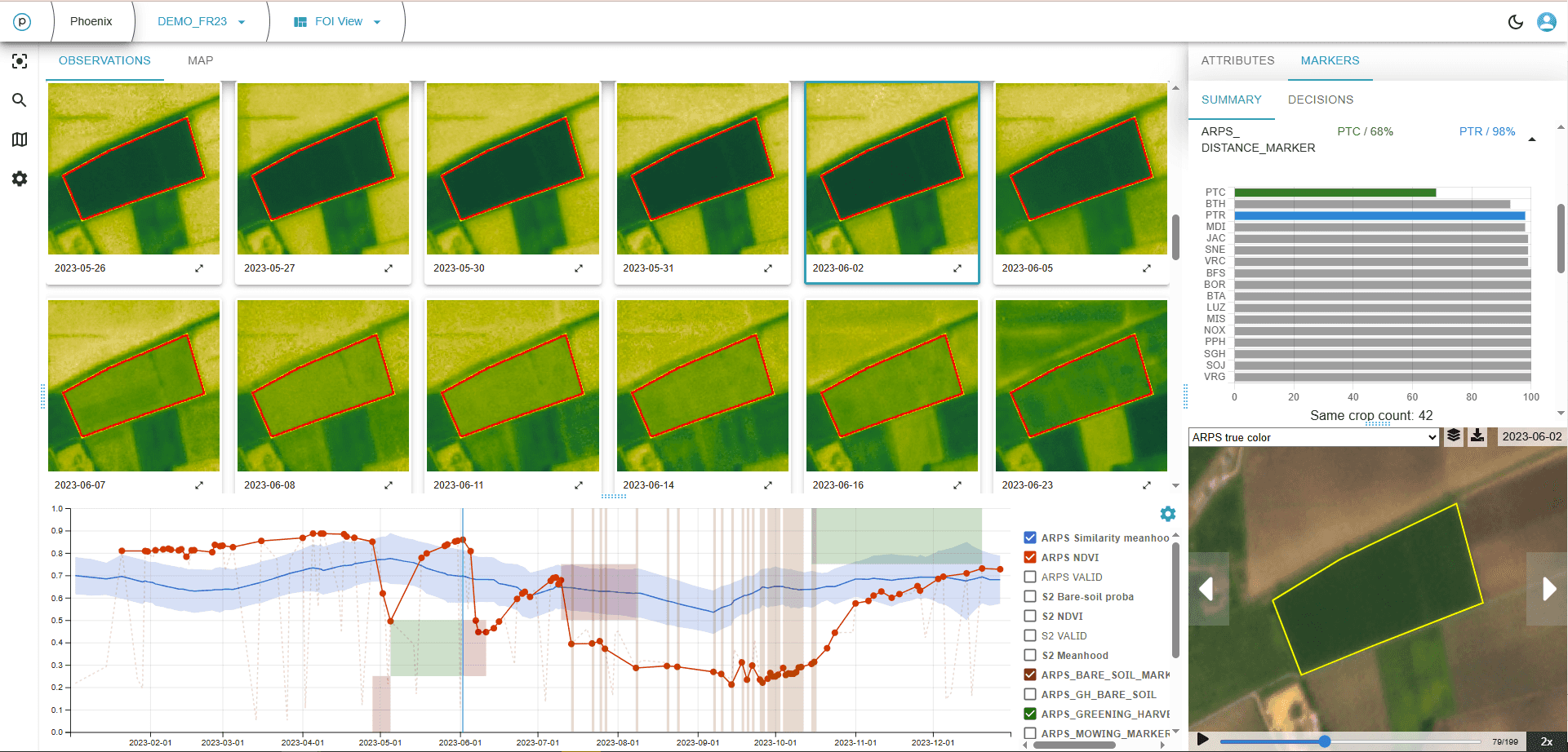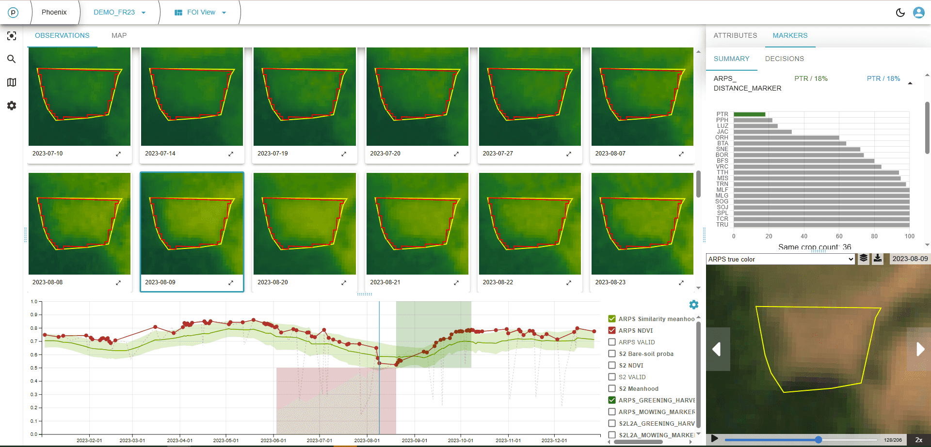 The Area Monitoring App screenshots below show two FOIs, both with a temporary prairie claim. The example on the left is found to be consistent with this claim according to the low distance marker score, while the example on the right with the high distance score is not. The latter is more similar to FOIs that claim to grow potato (PTC).